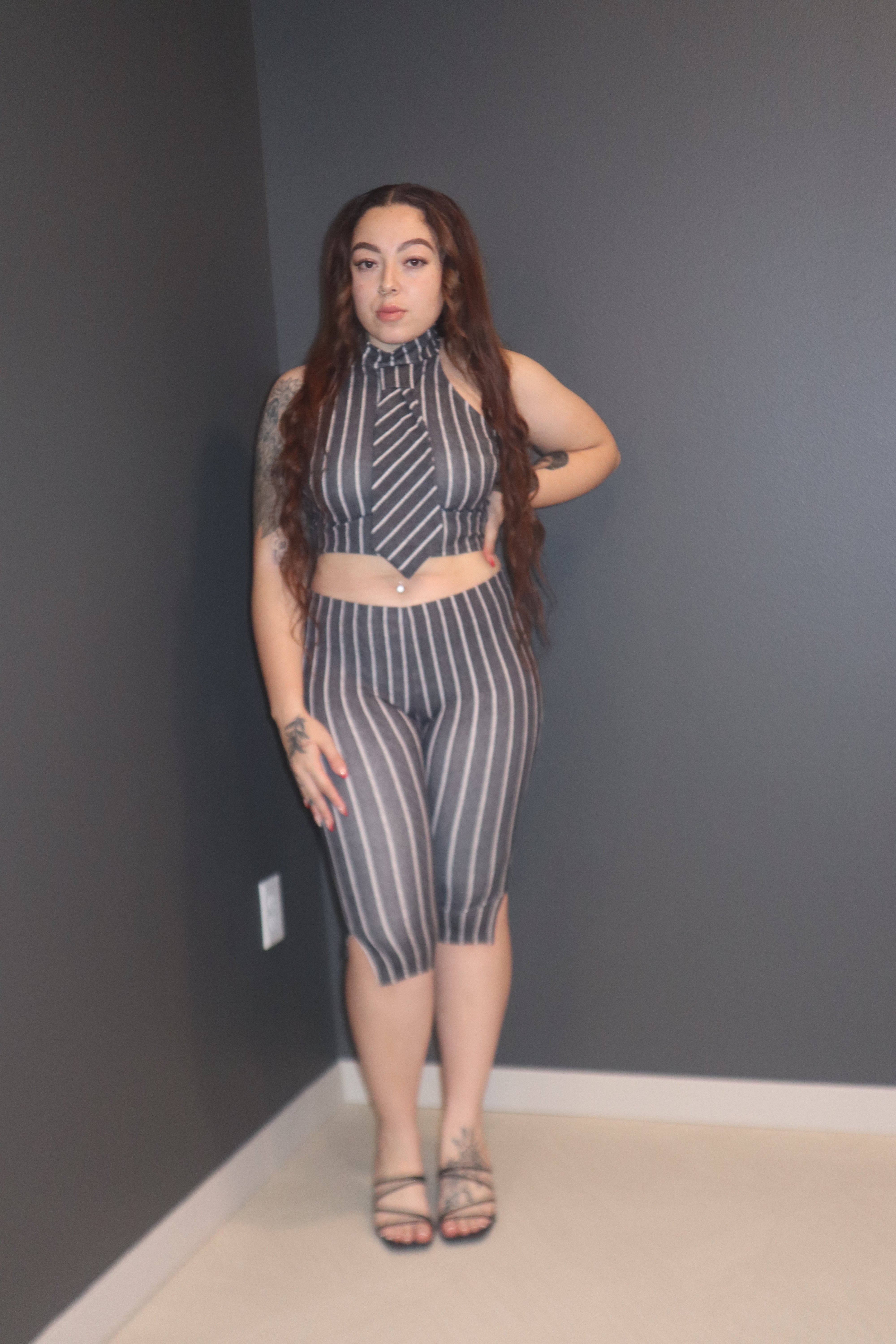 Step into your power with the Boss Up Baddie set. This sleek pinstripe two-piece hugs your curves in all the right places while giving off major CEO energy. Perfect for business brunches, baddie errands, or just being the boss you are. Pair it with heels and a bold lip to seal the deal.
